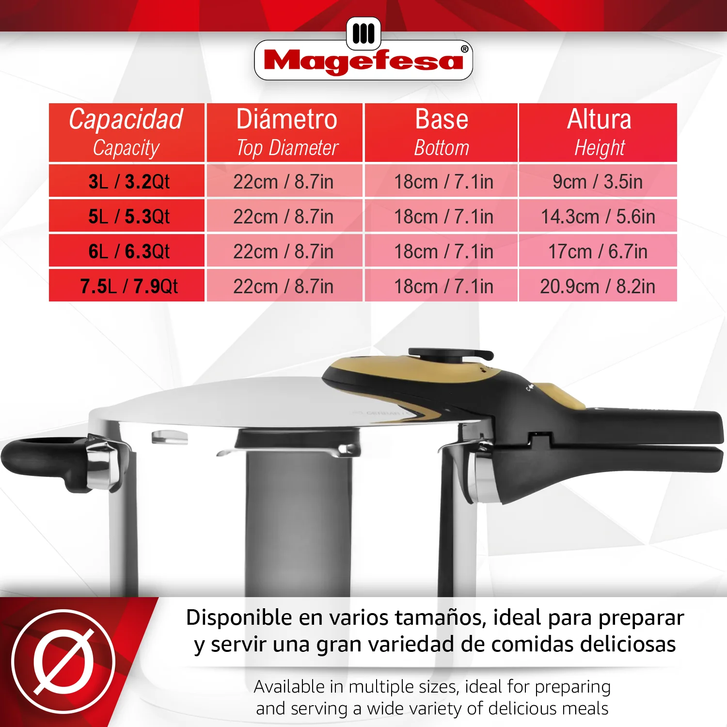 | Capacidad: | Disponible en: 5, 7.5 y 3+6 L. |
