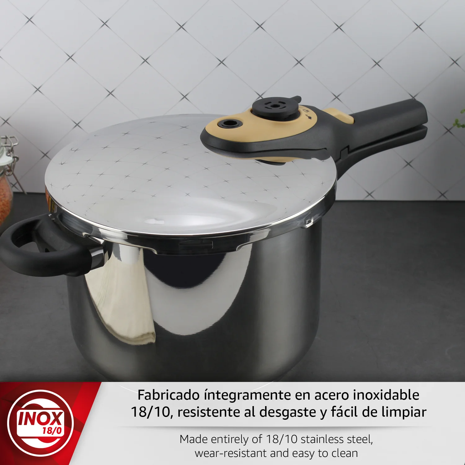 MATERIALES DURADEROS: Construida en acero inoxidable 18/10, la MAGEFESA ACTIVA2 MOSTAZA olla a presión es extremadamente resistente al desgaste y fácil de limpiar. Su fondo termo difusor de 5 capas garantiza una distribución uniforme del calor, asegurando resultados de cocción perfectos en todo momento. Producto de edición especial con el mango de color mostaza.