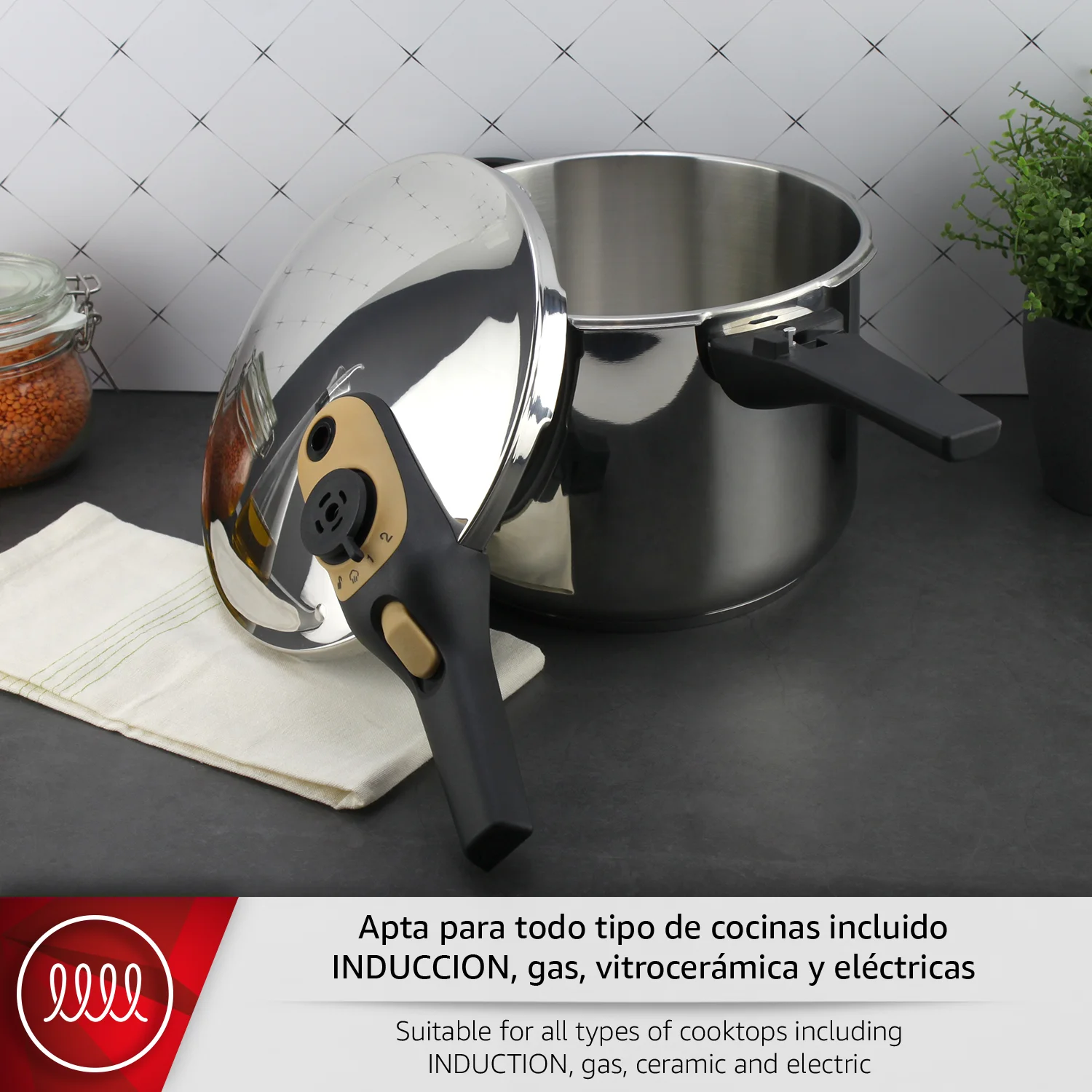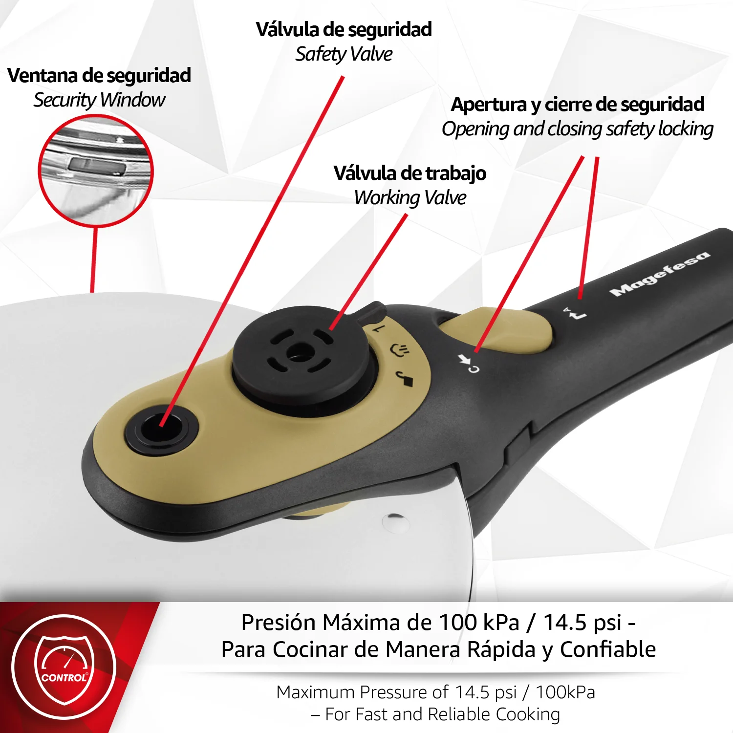 ALTA SEGURIDAD: Equipada con 5 sistemas de seguridad: sensor de presión, bloqueo de seguridad, válvula de trabajo, válvula de seguridad adicional y ventana de escape. Cocina con total tranquilidad sabiendo que cada componente de la olla express está diseñado para tu protección.