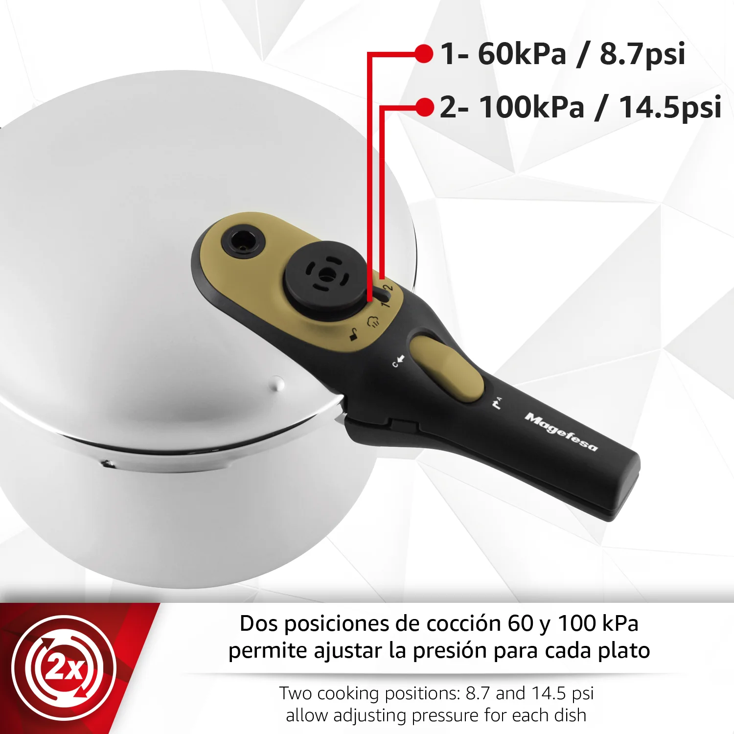 VERSATILIDAD DE COCCIÓN: Dos posiciones de cocción para adaptarse a tus necesidades: 60kPa para una cocción rápida y 100kPa para una cocción súper rápida, permitiéndote ajustar la presión según el tipo de alimento y el tiempo disponible.