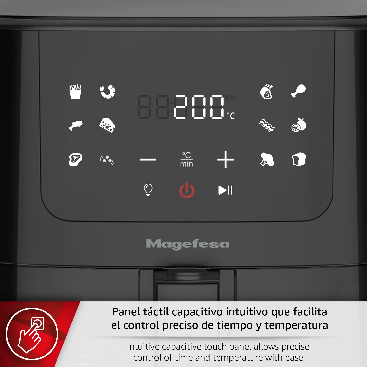 FÁCIL LIMPIEZA: Diseñada con controles intuitivos y piezas desmontables aptas para lavavajillas, la MAGEFESA ALISIA freidora de aire garantiza una experiencia de uso sencilla y una limpieza rápida. Su panel con doble luz indicadora y temperatura ajustable facilita el control total en cada preparación.