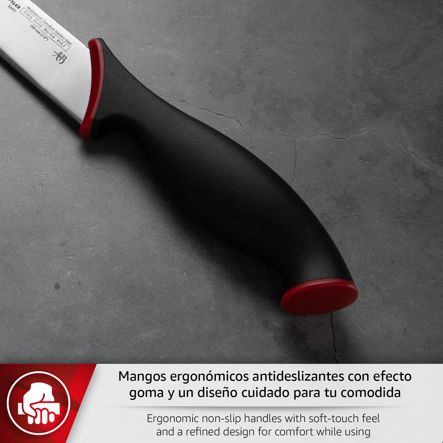 Fabricado en acero inoxidable con aleación de molibdeno-vanadio, ofrece una resistencia superior y una durabilidad excepcional, manteniendo el filo afilado durante más tiempo. Su mango ergonómico y antideslizante se adapta perfectamente a la mano, proporcionando un agarre seguro y cómodo incluso en usos prolongados.
