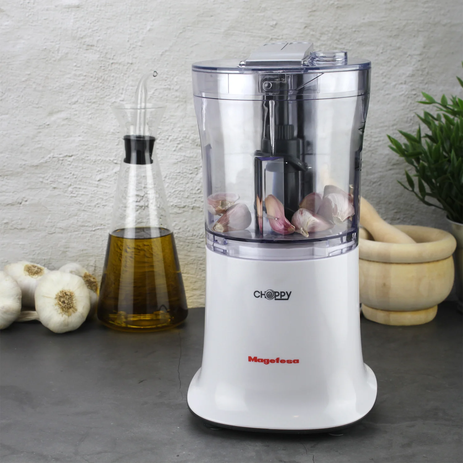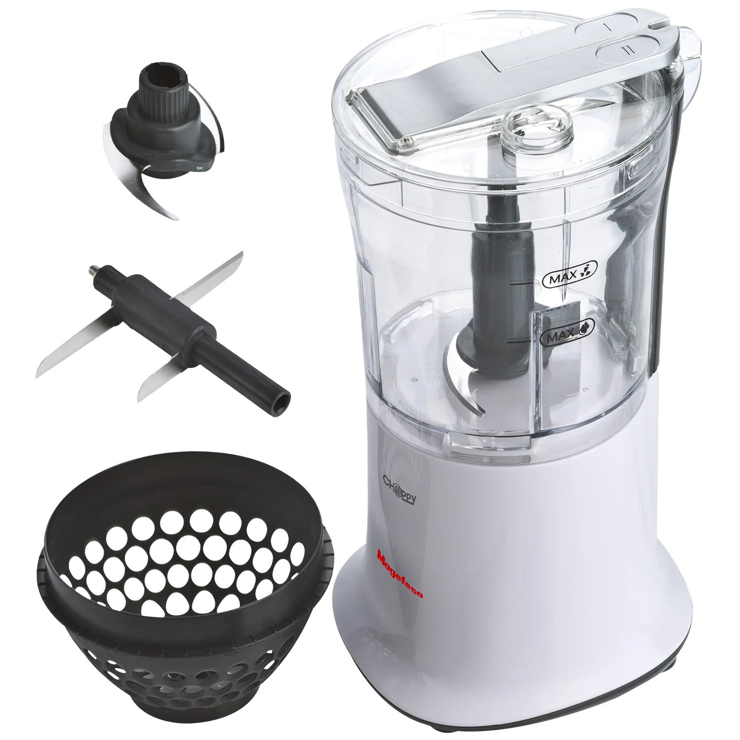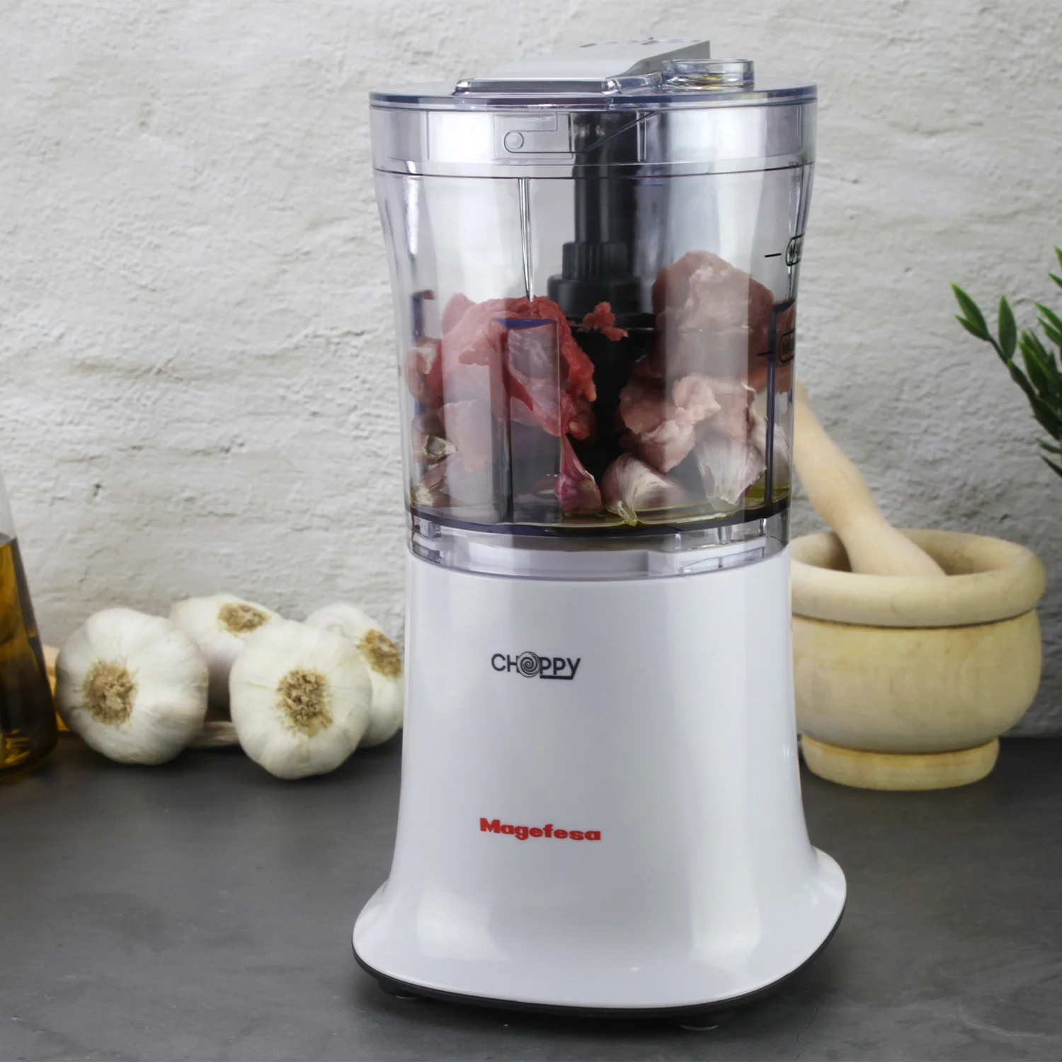 Da un salto de calidad en tu cocina con la MAGEFESA CHOPPY picadora eléctrica. Sus 500 W de potencia y 2 velocidades te permiten picar, rallar, emulsionar, licuar o batir con precisión, adaptando cada preparación a la textura que deseas. Incorpora dos juegos de cuchillas de acero inoxidable: una de 4 hojas para acabados finos y otra de 3 hojas para cortes más gruesos y uniformes, logrando resultados perfectos en salsas, guisos o cremas.