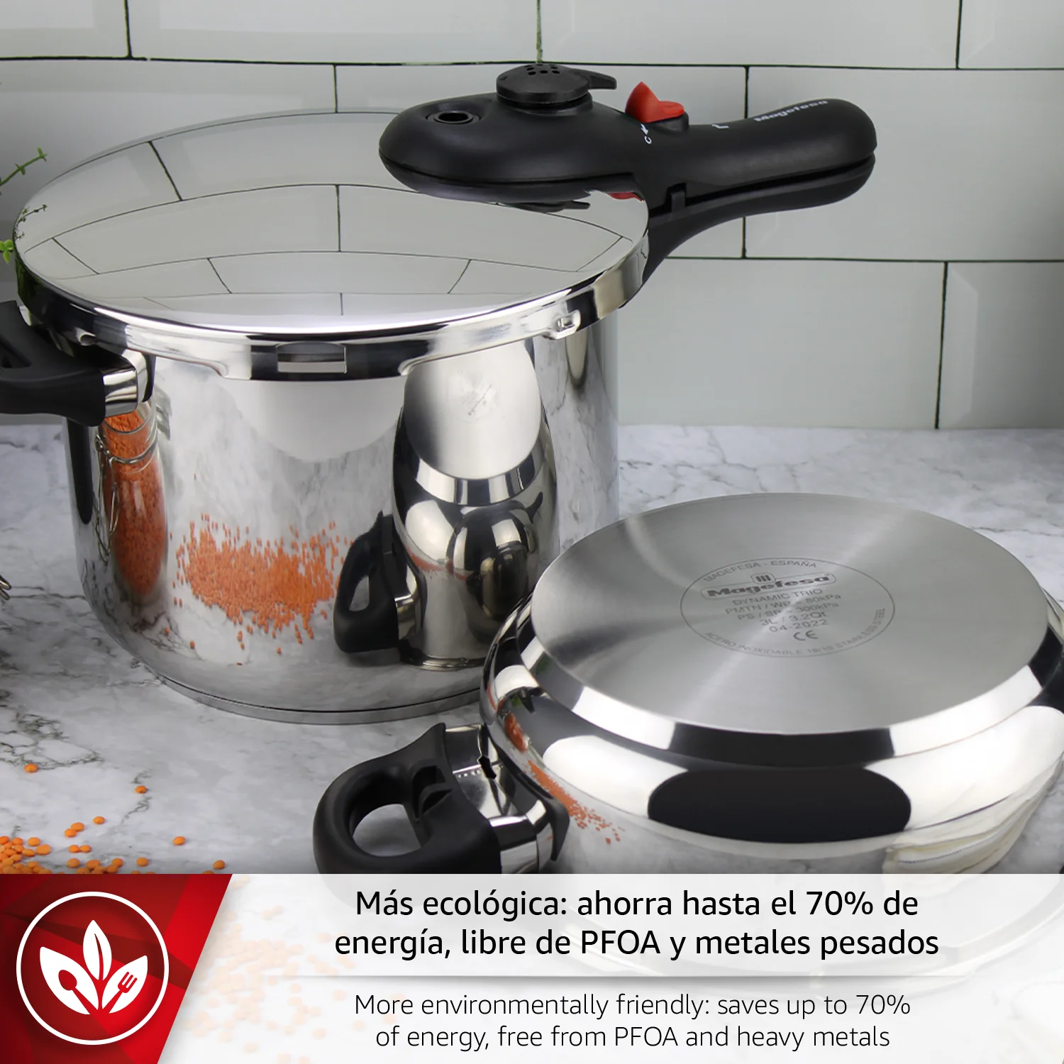 EFICIENCIA ENERGÉTICA: La olla express MAGEFESA DB cocina la carne utilizando solo 1/15 de la energía calorífica que se suele necesitar y puede preparar las alubias pintas con apenas 1/3 de la energía normal necesaria. Al cocinar a temperaturas más elevadas, la olla a presión cocina de forma más rápida, lo que ahorra tiempo y energía. Asas laterales termo-resistentes aseguran un manejo cómodo y seguro.