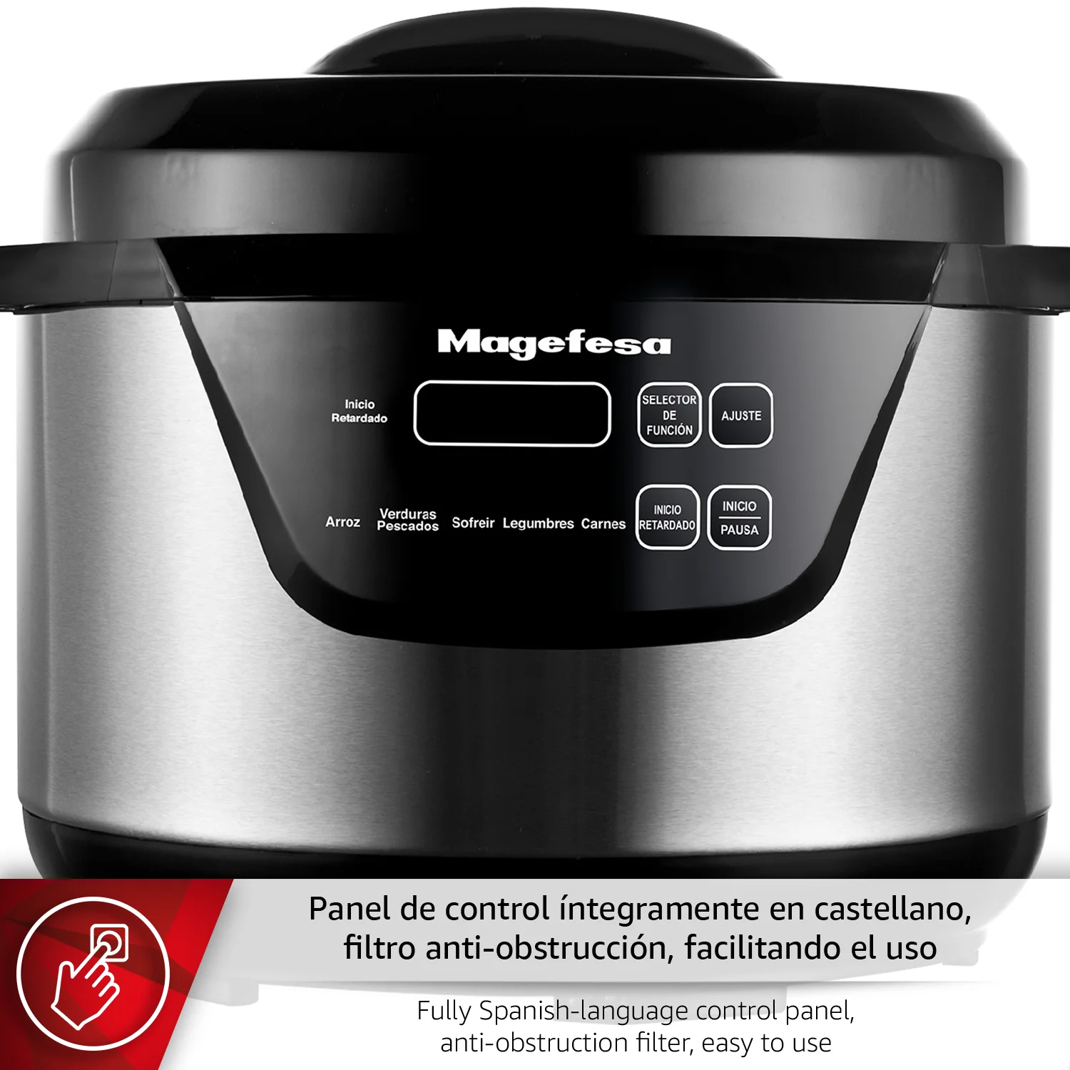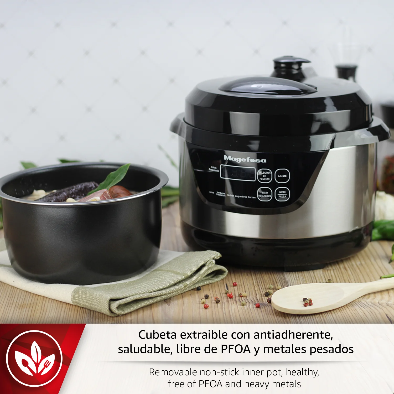 El panel selector con pantalla intuitiva facilita un manejo rápido incluso para usuarios sin experiencia. Incorpora tres sistemas de seguridad y un recipiente antiadherente extraíble apto para lavavajillas, garantizando una limpieza sencilla. Además, incluye un práctico recetario para inspirarte y aprovechar al máximo cada preparación.