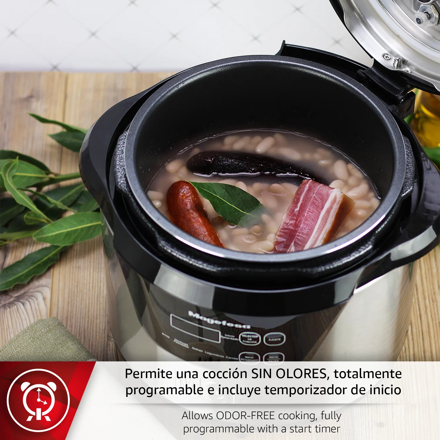 Cuenta con 6 funciones distintas que permiten cocinar de forma tradicional o a presión, adaptándose a todo tipo de recetas como carnes, legumbres, sopas, arroz y verduras, siempre sin olores y con un sabor óptimo. Su temporizador programable permite retrasar el inicio de la cocción para que la comida esté lista justo cuando la necesitas, sin supervisión constante.
