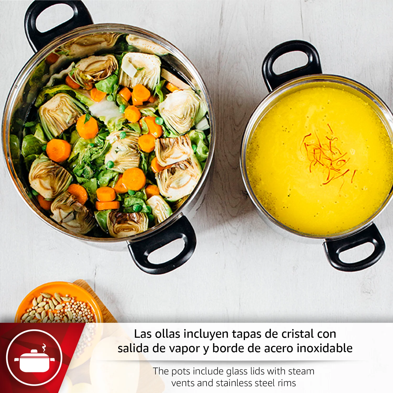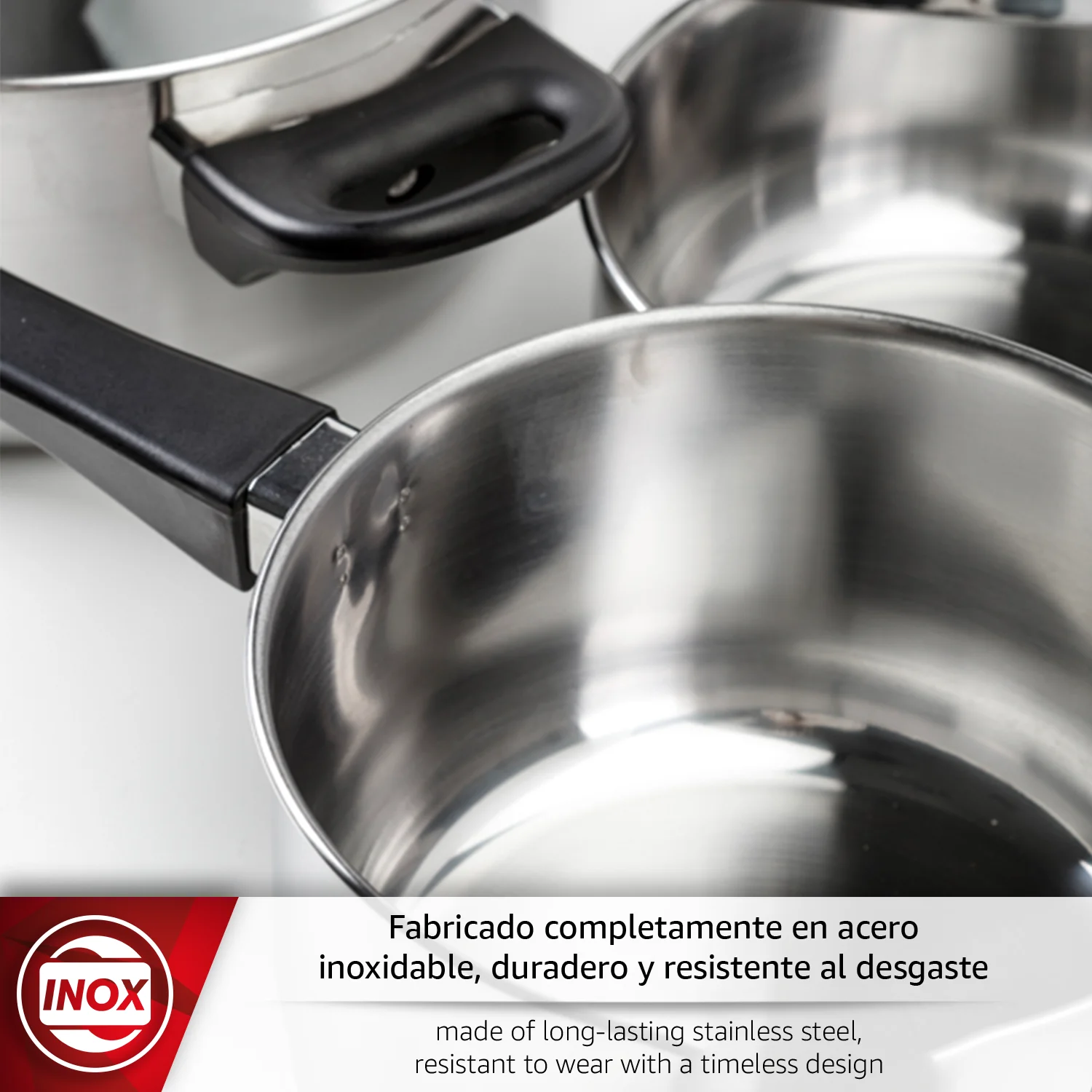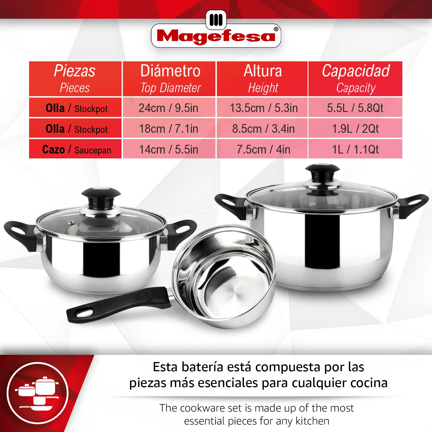 Descubre la MAGEFESA FAMILY 5 batería de cocina de 5 piezas, fabricado en acero inoxidable con elegante acabado pulido en espejo. Incluye 2 cacerolas con tapa de 18 y 24 cm y un cazo de 14 cm, perfectos para todo tipo de recetas. Las tapas de cristal templado con válvula de vapor permiten supervisar la cocción sin perder calor ni sabor, manteniendo tus platos jugosos y llenos de aroma.