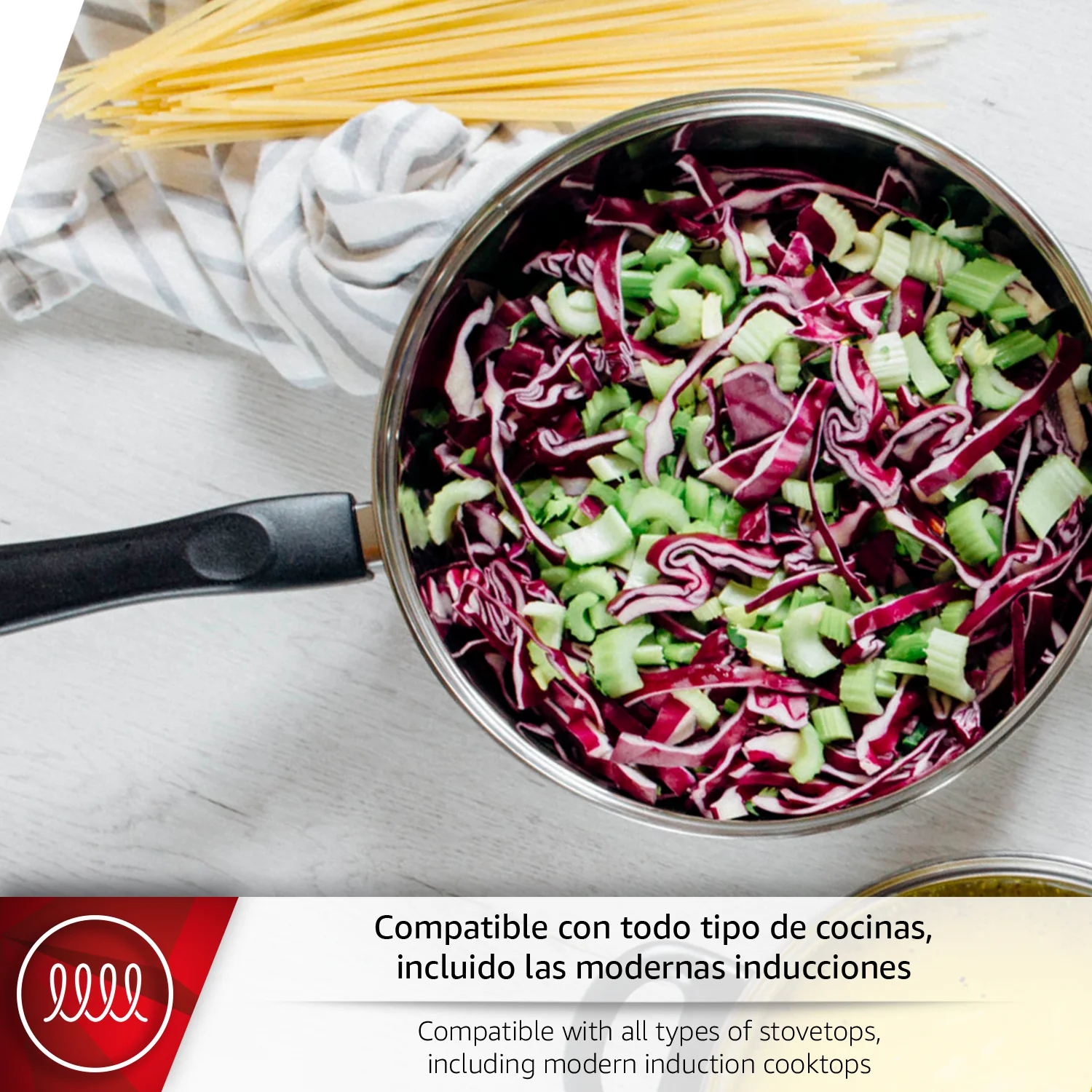 Su fondo difusor garantiza una distribución uniforme del calor, optimizado para inducción y compatible con cualquier cocina. Cocina con eficiencia y seguridad mientras disfrutas de un menaje duradero que combina estilo y funcionalidad. Transforma tu experiencia culinaria y descubre cómo cada preparación se vuelve más fácil y deliciosa.