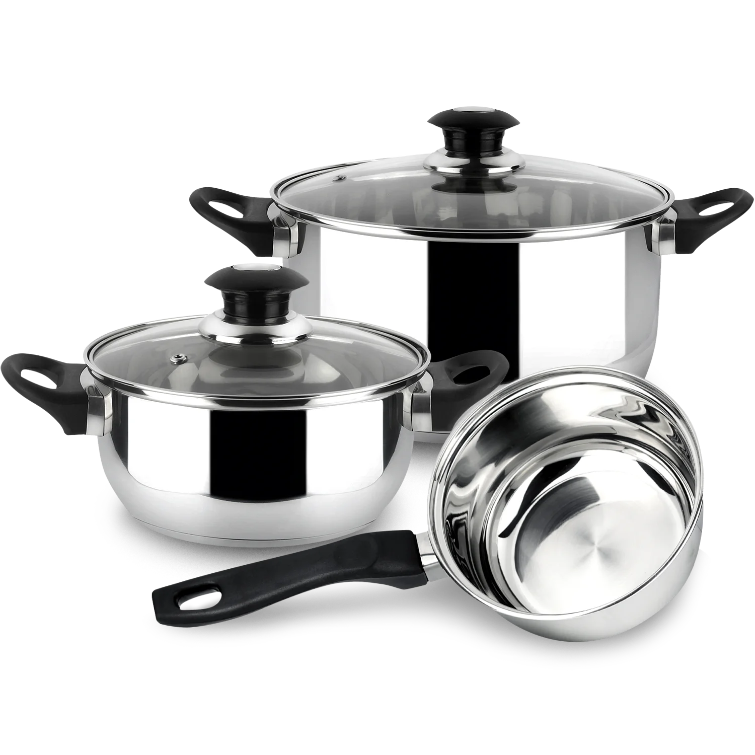 FAMILY Batería de Cocina de 5 Piezas Fabricada en Acero Inoxidable, Compuesta por 2 Cacerolas, 1 Cazo y 2 Tapas de Vidrio, Compatible con Inducción