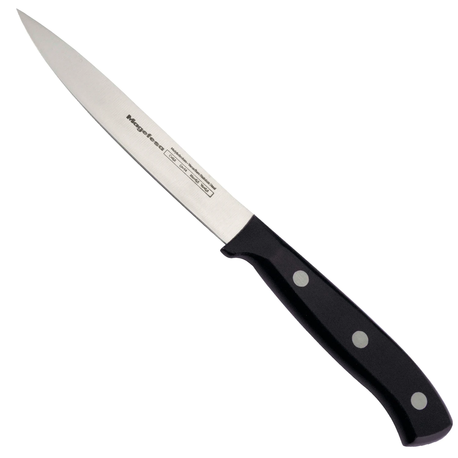 MANGO ERGONÓMICO: El MAGEFESA FILO cuchillo de cocina universal está diseñado para brindar comodidad durante su uso prolongado, cuenta con un mango antideslizante y triplemente remachado que asegura un agarre firme, estable y seguro.