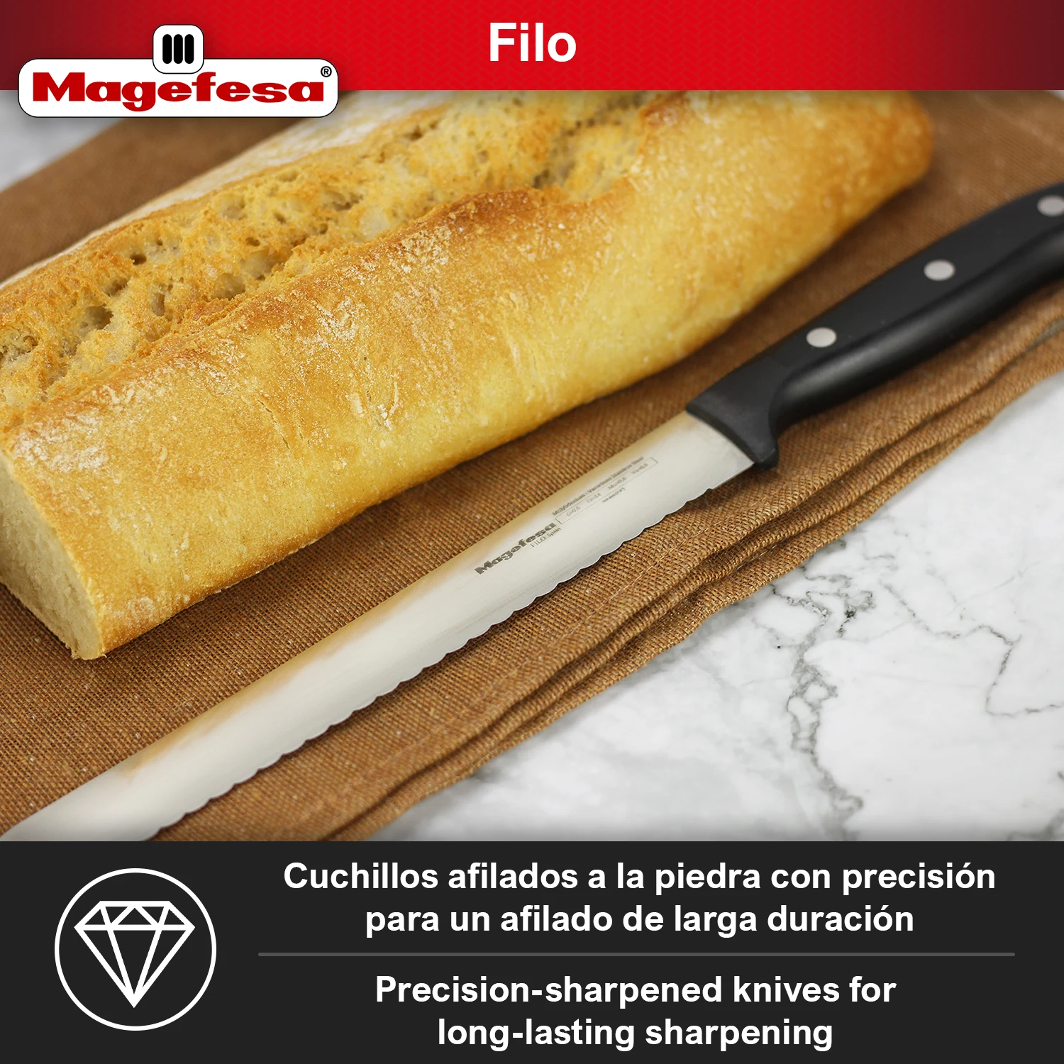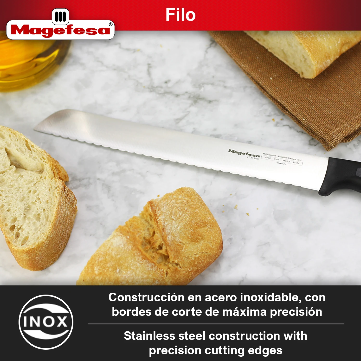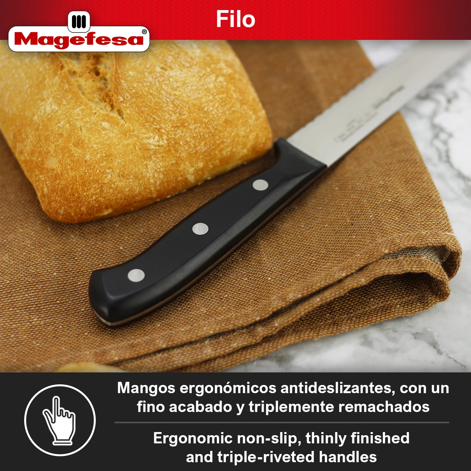 Corta con precisión profesional y mejora cada preparación con el MAGEFESA FILO cuchillo panero. Fabricado en acero inoxidable y afilado a la piedra, garantiza un corte fino, limpio y duradero, ideal para obtener lonchas perfectas de pan o jamón en cada uso.