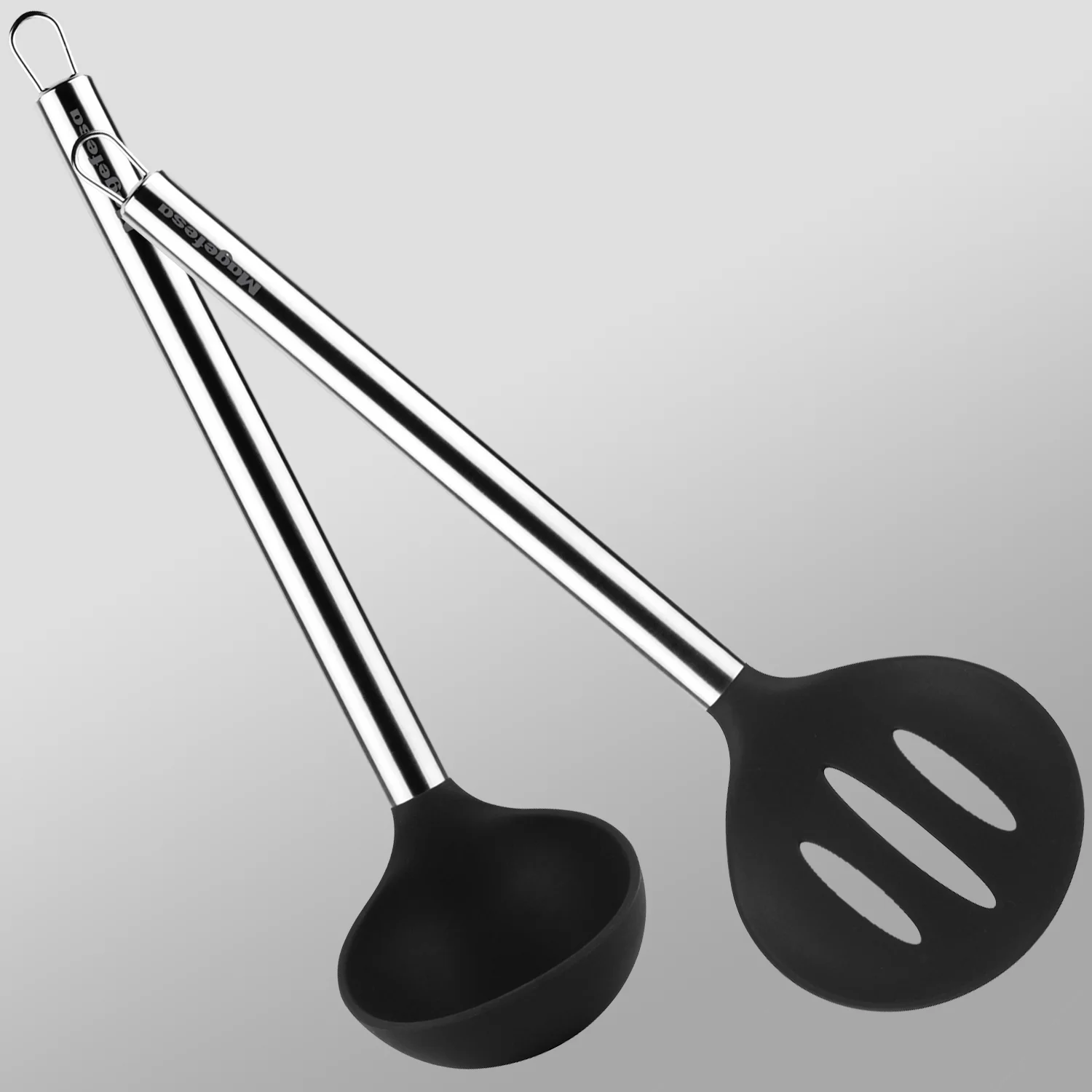 DISEÑO MODERNO: El FORTE set de 2 utensilios de cocina de MAGEFESA dispone de: mango de acero inoxidable con logo grabado y un gancho integrado para colgar fácilmente. Funcionalidad y estilo profesional que se integran en cualquier cocina moderna.