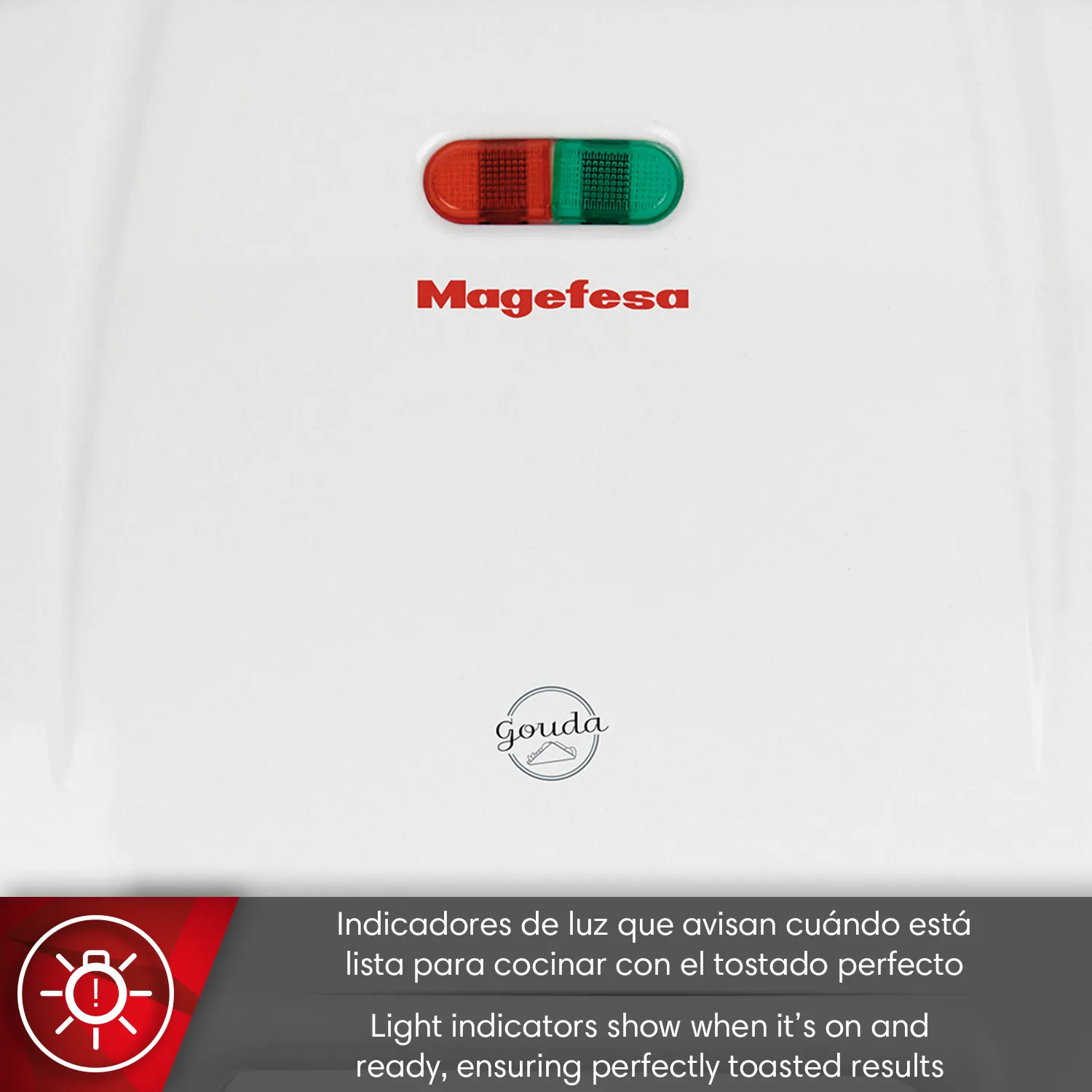 Prepara sándwiches deliciosos en minutos con la GOUDA sandwichera de MAGEFESA y simplifica tu día a día en la cocina. Sus placas con revestimiento antiadherente evitan que los alimentos se peguen, permiten retirarlos con facilidad y hacen que la limpieza sea tan rápida como pasar un paño húmedo. Con capacidad para dos sándwiches a la vez, es ideal para desayunos, cenas rápidas o cualquier antojo entre horas.
