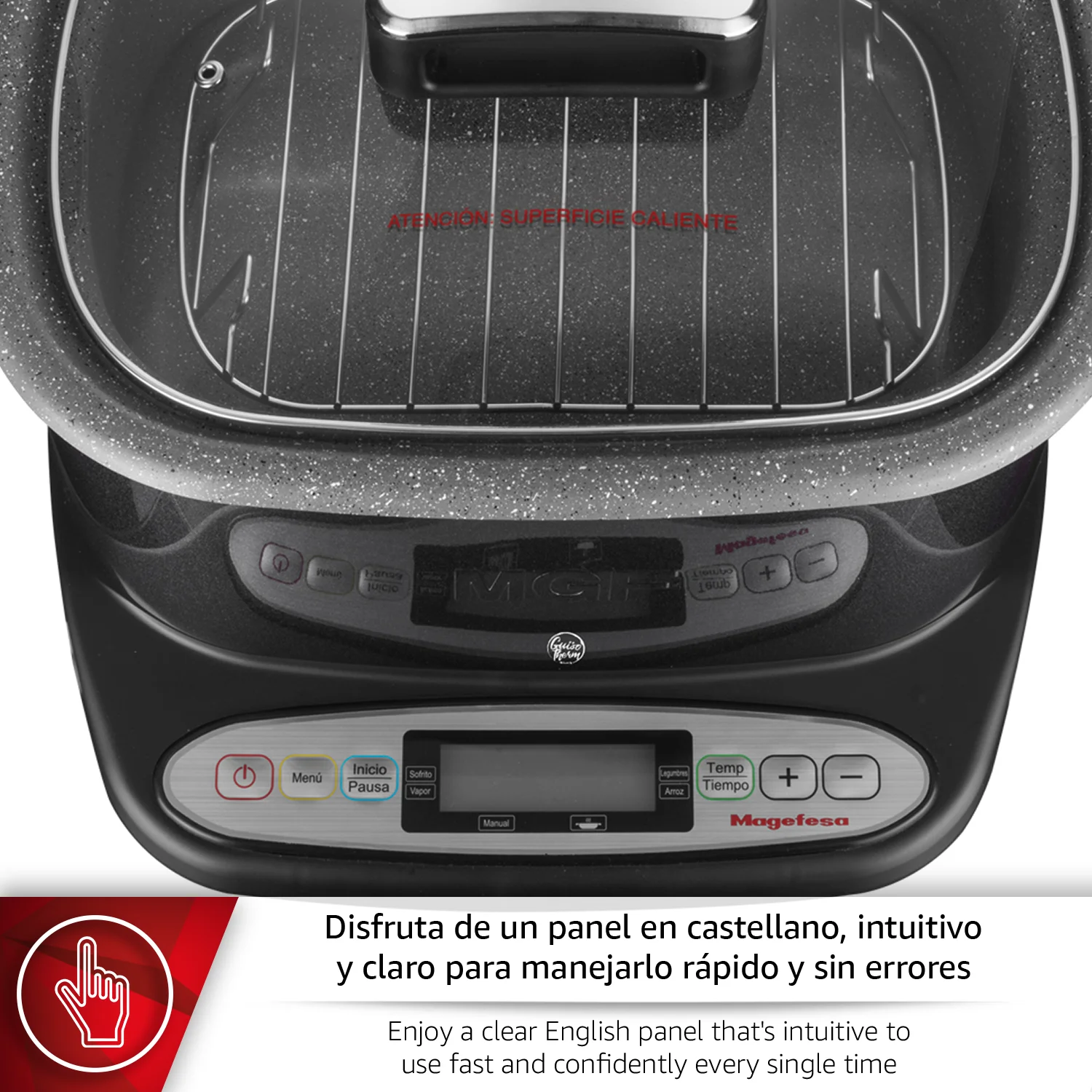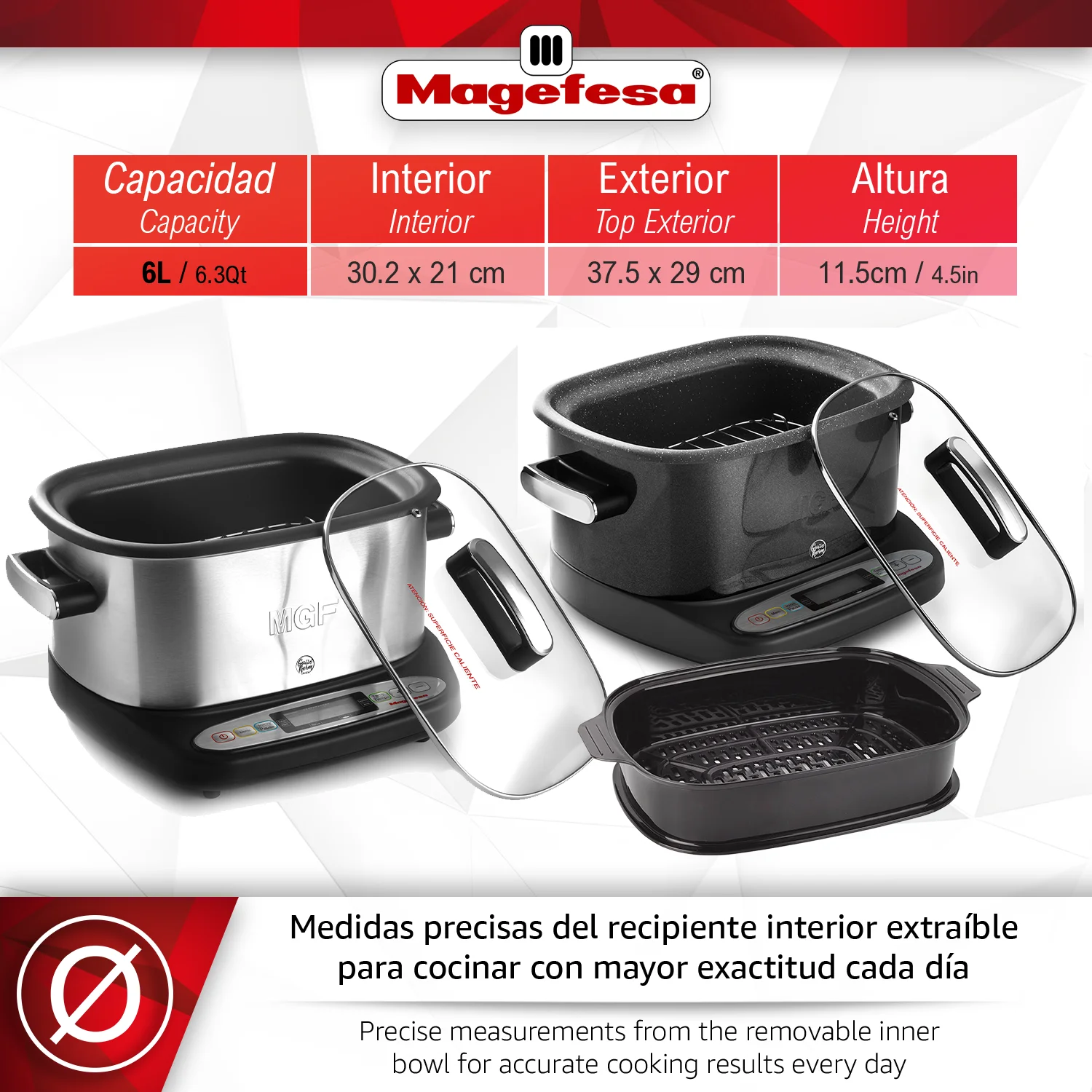 LISTA PARA FREÍR: La MAGEFESA GUISOTHERM BLACK olla eléctrica programable dispone de potencia suficiente para cocinar frituras, gracias a la rejilla-grill de acero inoxidable (incluida) proporciona la opción de asar y brasear carnes y pescados, agregando variedad a tus comidas.