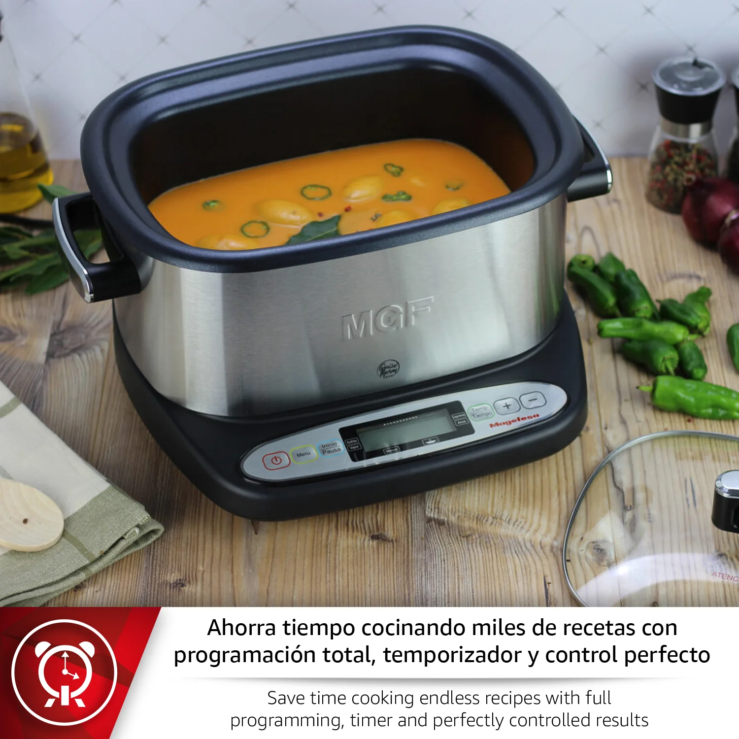 Descubre la MAGEFESA GUISOTHERM BLACK olla eléctrica programable y simplifica tu cocina diaria. Su recipiente antiadherente de 6 L y 1250 W de potencia permite freír, sofreír, asar, hervir, cocinar al vapor, sous-vide o confitar con total comodidad. Programa tiempo y temperatura desde su pantalla LCD y controla el proceso sin levantar la tapa gracias al vidrio templado con salida de vapor.