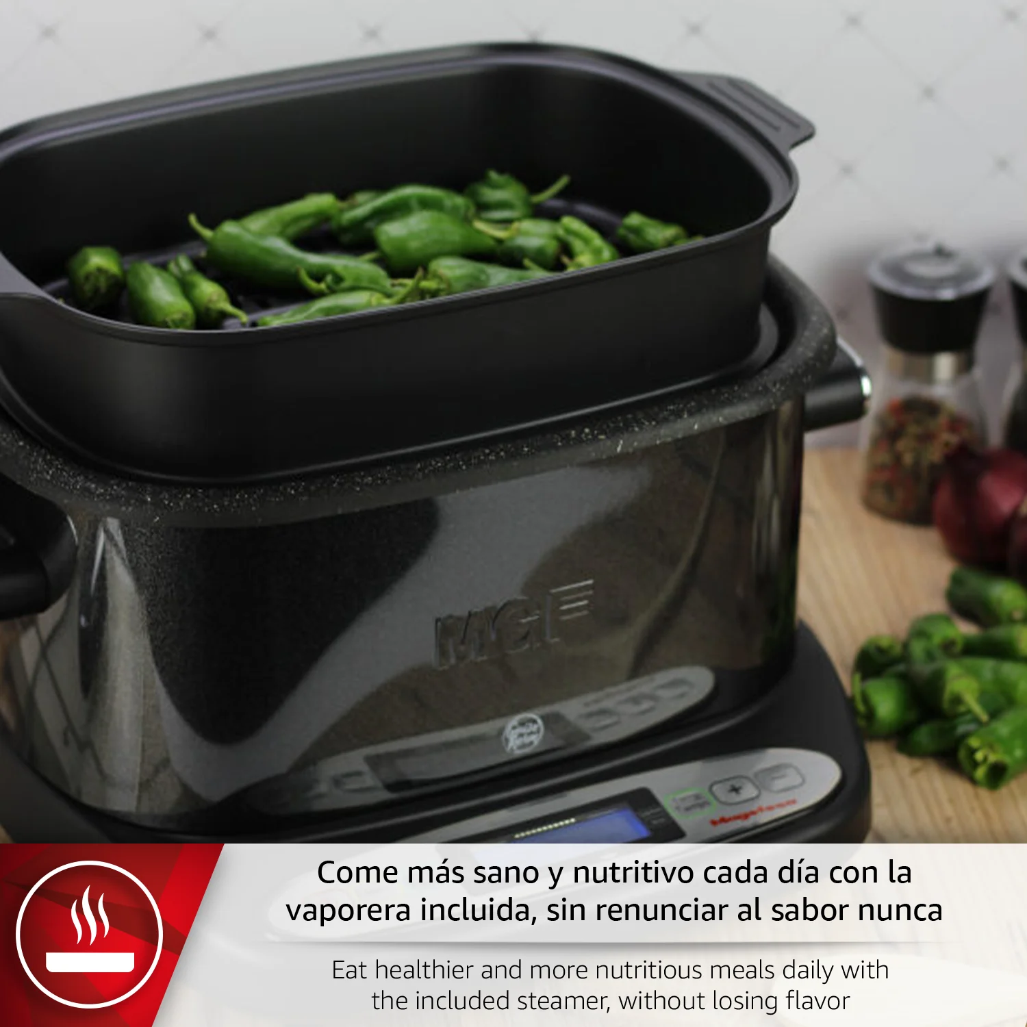 COCINA SIN COMPLICACIONES: Disfruta más tu tiempo mientras la GUISOTHERM BLACK olla eléctrica programable de MAGEFESA cocina por ti. Programa el menú, ajusta la temperatura y deja la olla prepare guisos, frituras y mucho más sin ensuciar gracias a su recipiente antiadherente. Simplifica tu día y cocina sin esfuerzo.