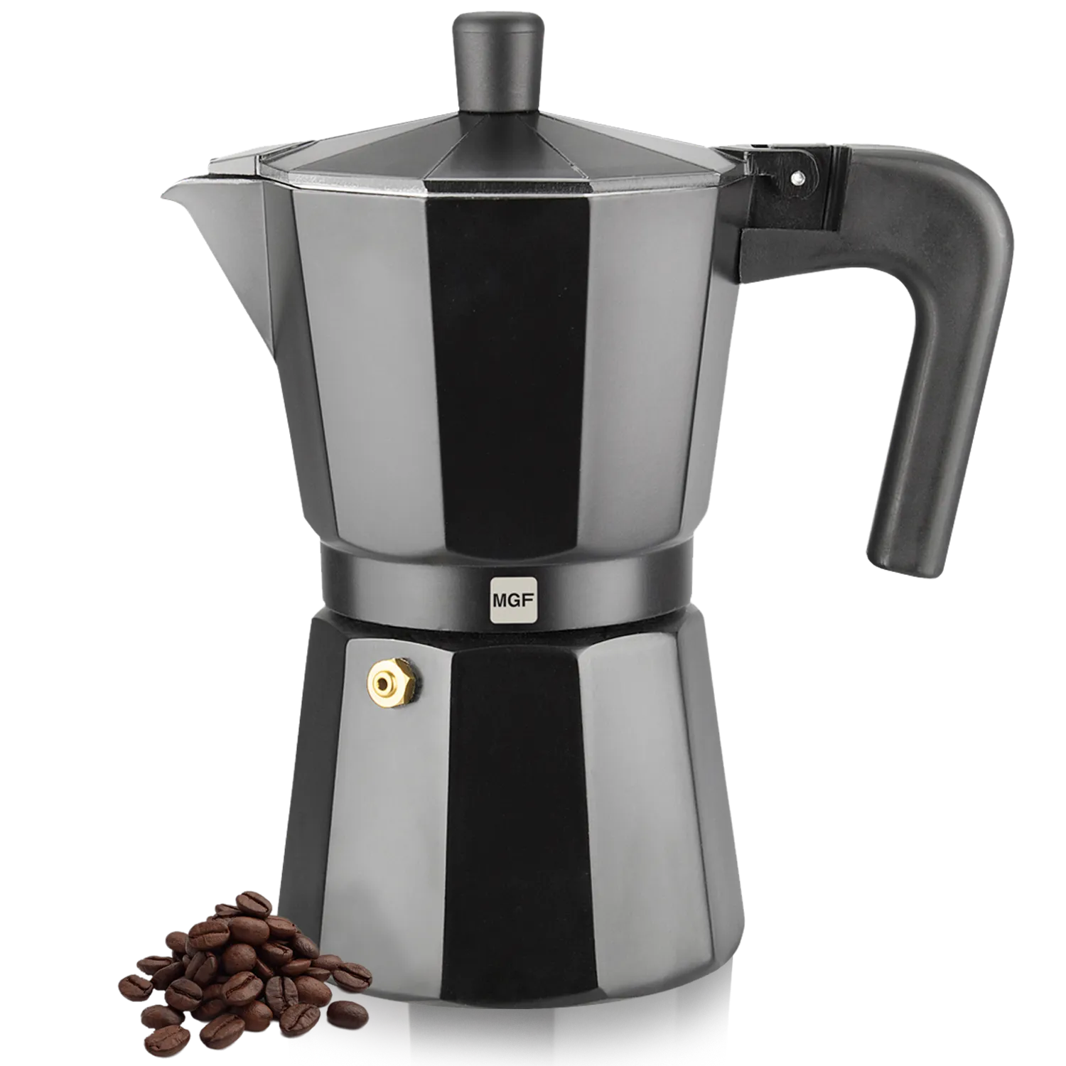 La MAGEFESA KENIA NOIR cafetera italiana está fabricada en aluminio, un material muy ligero y con una gran capacidad para transmitir el calor y la electricidad, lo que se traduce en un menor consumo de tiempo y energía. Gracias a ello, la temperatura se distribuye de manera homogénea por toda la superficie.