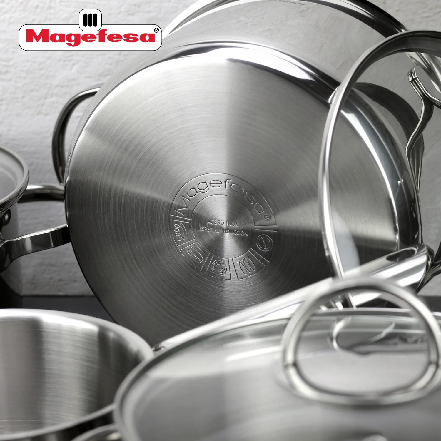 APTO PARA TODO TIPO DE COCINAS: Las piezas MAGEFESA MAG tienen un fondo termo difusor encapsulado, por lo que es compatible con cualquier tipo de cocina desde gas hasta inducción. Ahorrará en la factura de la luz, ya que, necesitan un 75% menos energía para producir el calor que necesitas para cocinar.