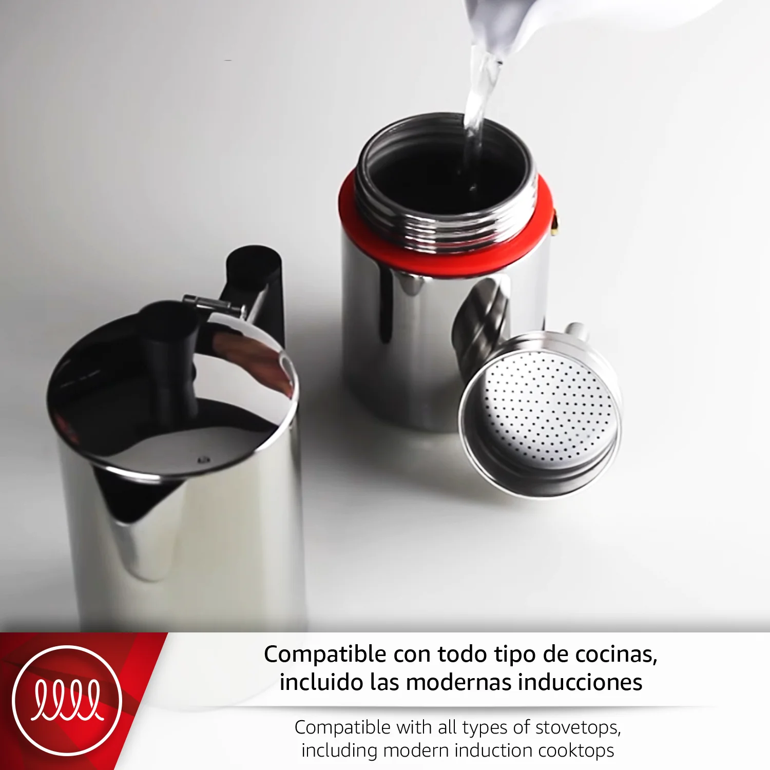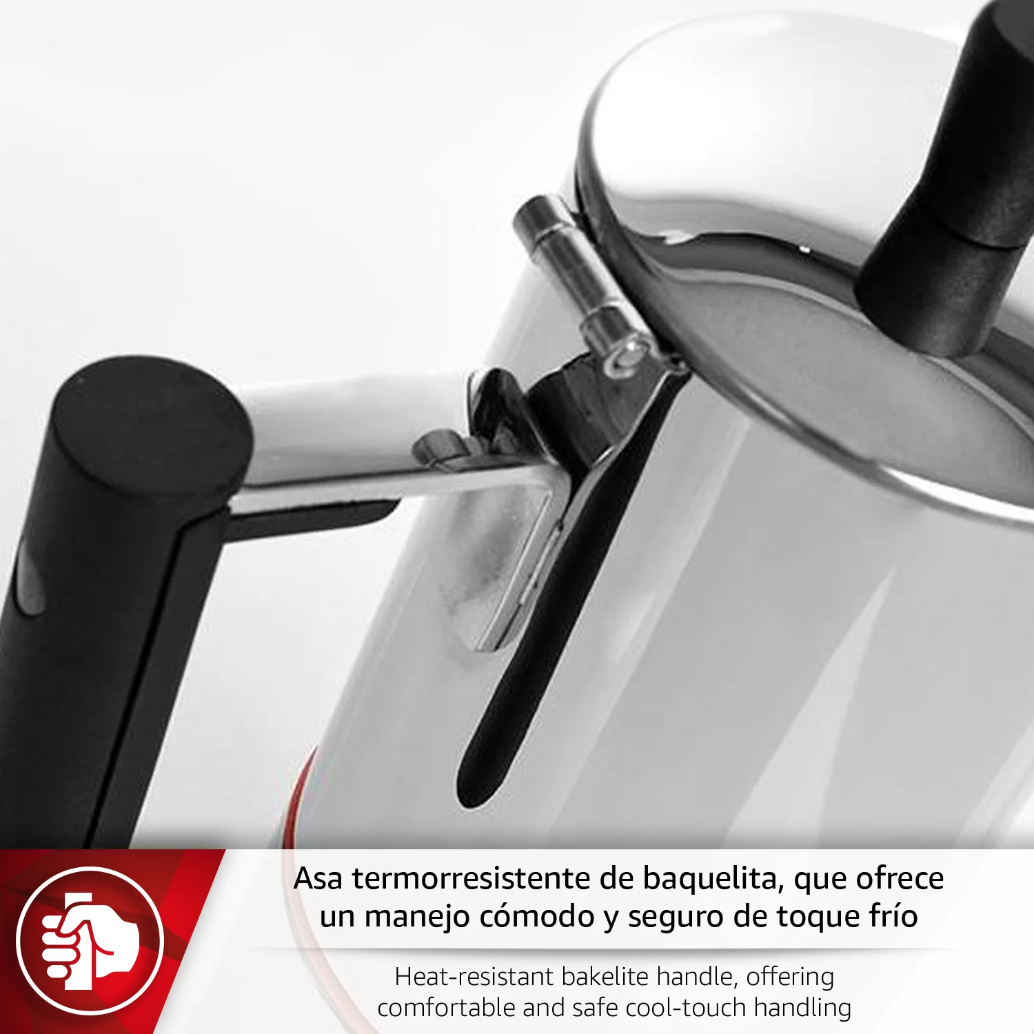 Su mango ergonómico de baquelita termorresistente ofrece un agarre cómodo y seguro de toque frío, aportando practicidad y un diseño que encaja en cualquier cocina. Gracias a su fondo de inducción total “Full Induction”, es apta para todo tipo de cocinas, incluida inducción, permitiendo un importante ahorro energético de hasta un 75 %. Con unas dimensiones de 22 cm de altura, base de 8 cm y 16 cm desde el asa hasta la boquilla, combina funcionalidad, eficiencia y estilo para que disfrutes del auténtico aroma del café en cada preparación.