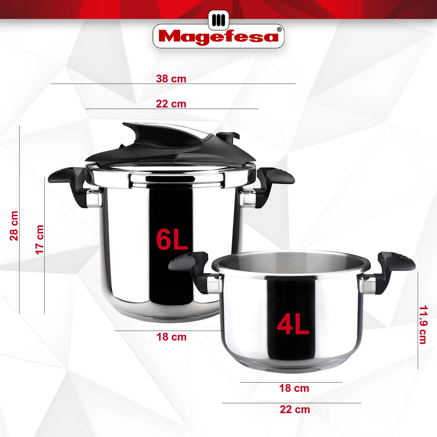 Olla a presión súper rápida NOVA, está fabricada en acero inoxidable 18/10 muy resistente al desgaste, con fondo termo difusor encapsulado de 5 capas que permite una difusión rápida y uniforme del calor. Su tipo de cierre, permite un manejo cómodo y sencillo con sólo un giro de muñeca.