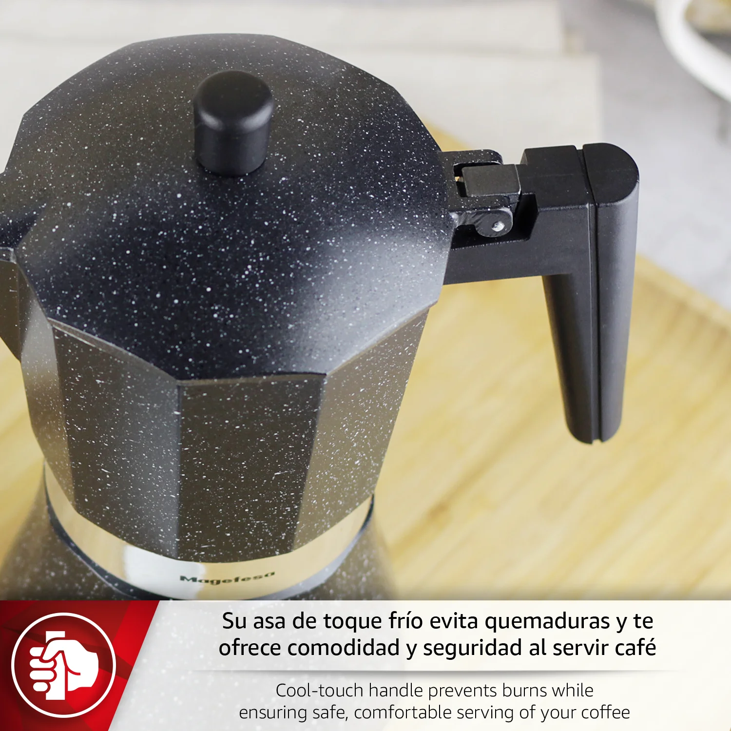 ASA Y POMO DE BAQUELITA: Manipula tu MAGEFESA ONIX cafetera italiana con total tranquilidad gracias a su asa y pomo termoaislantes de baquelita, diseñados para mantener el toque frío durante la preparación. La cafetera combina seguridad y durabilidad para que servir el café sea cómodo y seguro. Una cafetera italiana pensada para facilitar tu día a día.