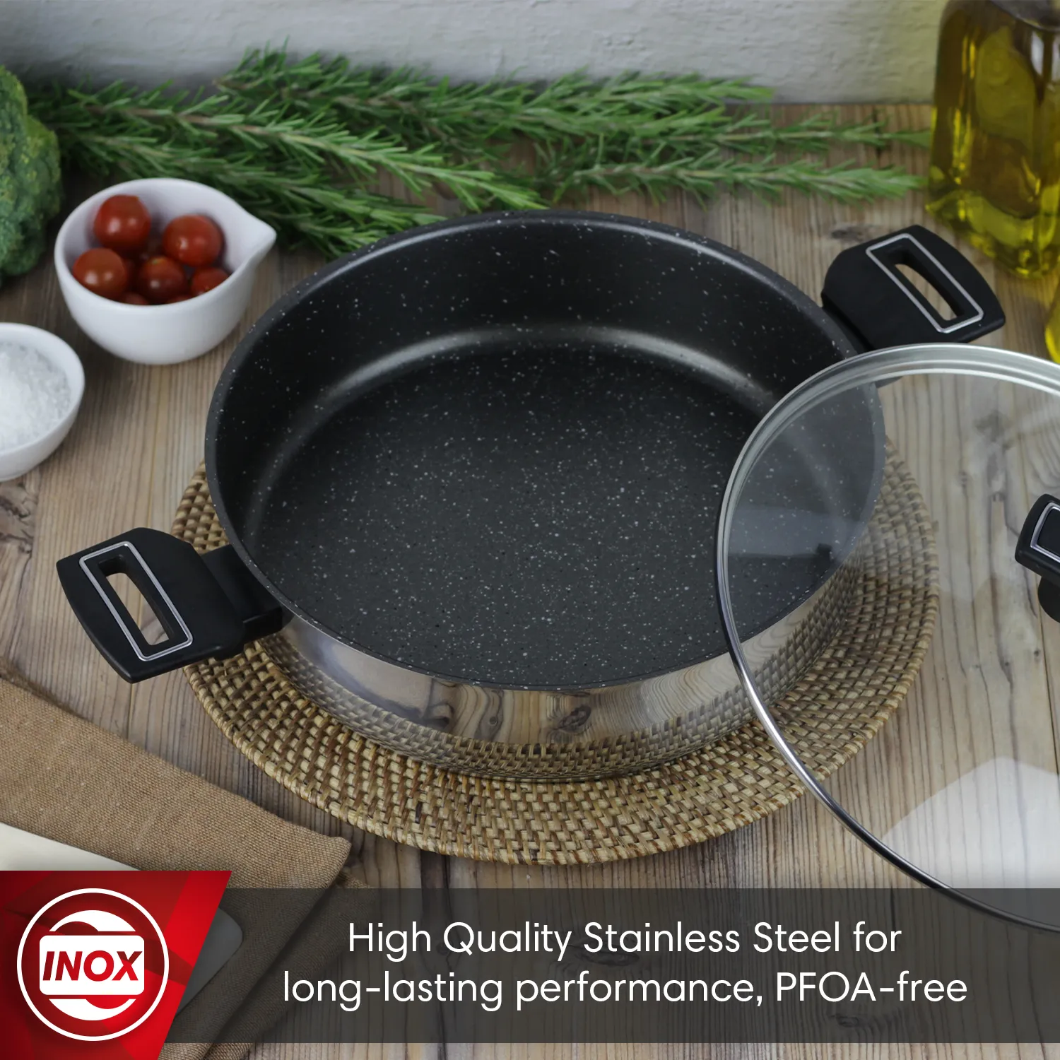ACERO INOXIDABLE: La tartera está elaborada en acero inoxidable 18/10 de alta calidad, un material duradero y resistente que garantiza una larga vida útil y un rendimiento óptimo incluso tras un uso intensivo en la cocina.
