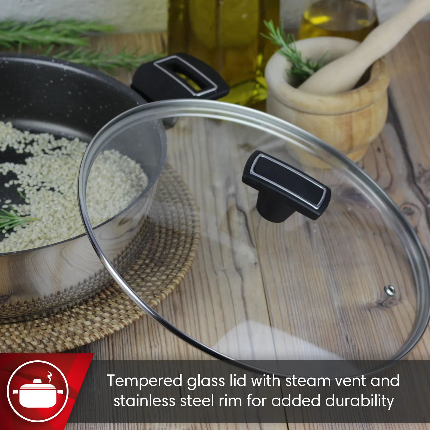 ASAS Y POMO DE BAQUELITA: La tartera cuenta con asas y pomos ergonómicos fabricados en baquelita termoaislante e ignífuga que aportan comodidad y seguridad al manipular la cacerola, incluso cuando está caliente.