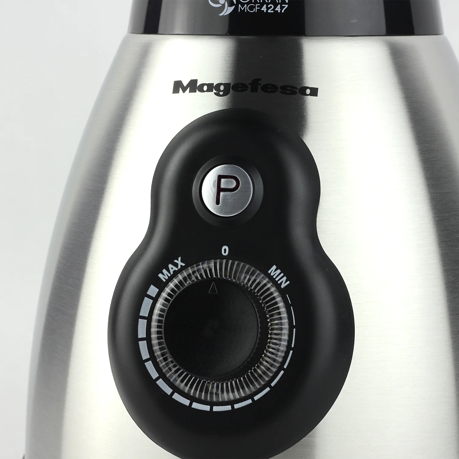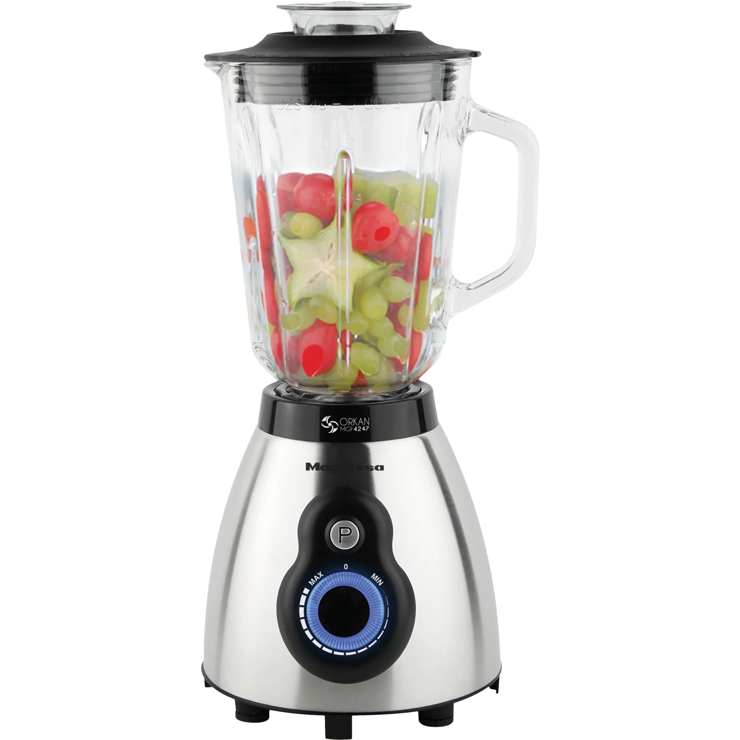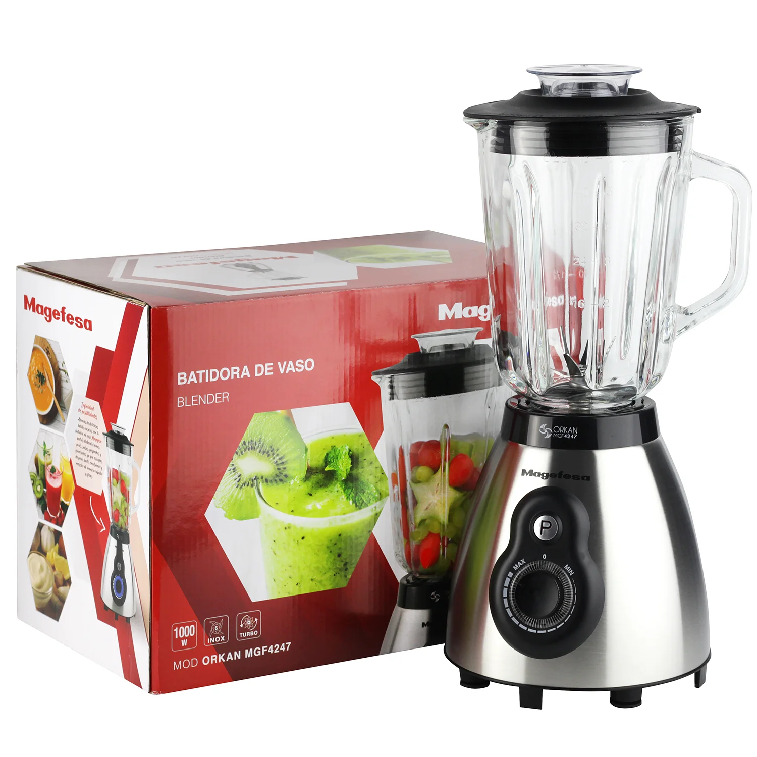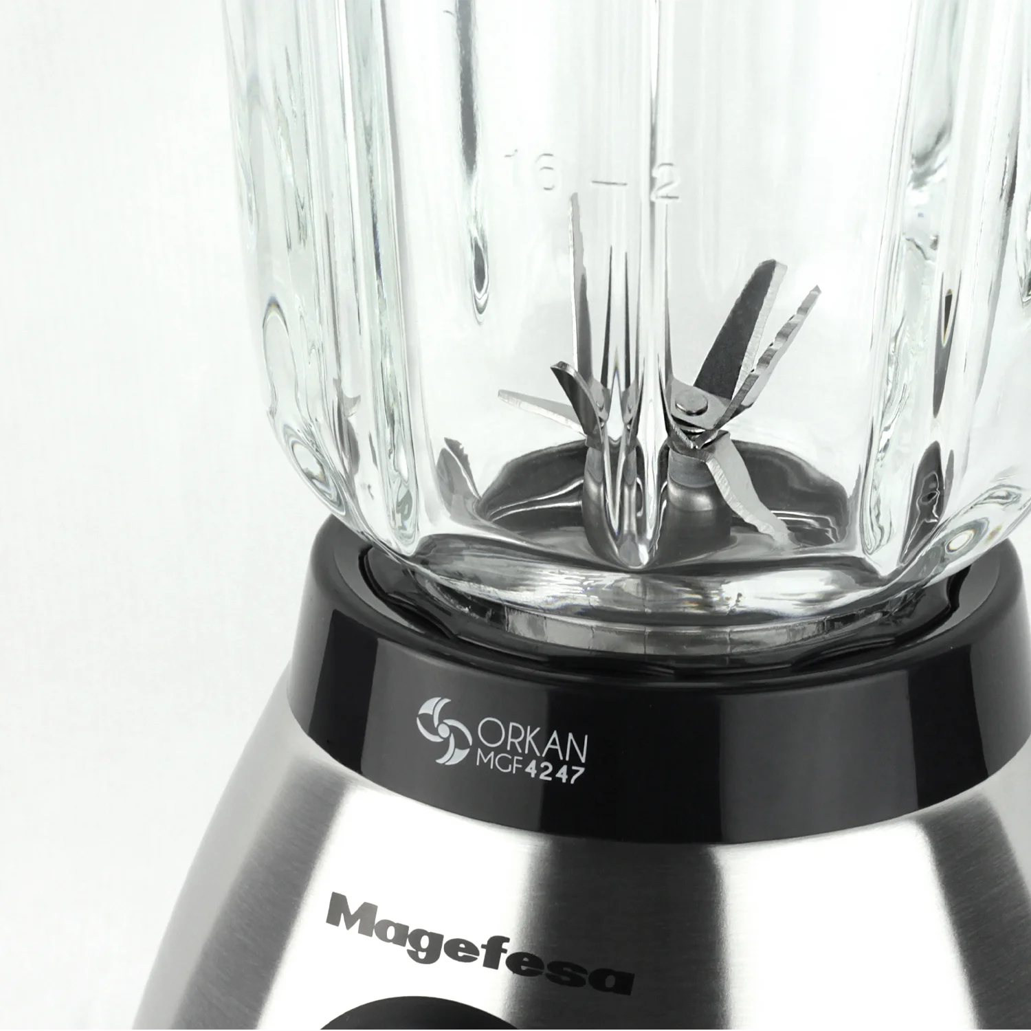 Potencia tu cocina y consigue resultados perfectos en segundos con la MAGEFESA ORKAN licuadora. Su motor de 1000W, junto a sus cuchillas de acero inoxidable de alta resistencia, tritura, mezcla y pica hielo sin esfuerzo, logrando batidos, cremas y recetas con la textura ideal. La jarra de cristal de 1,5L permite preparar varias raciones cómodamente, mientras el selector de velocidad progresiva y la función turbo se adaptan a cada elaboración.