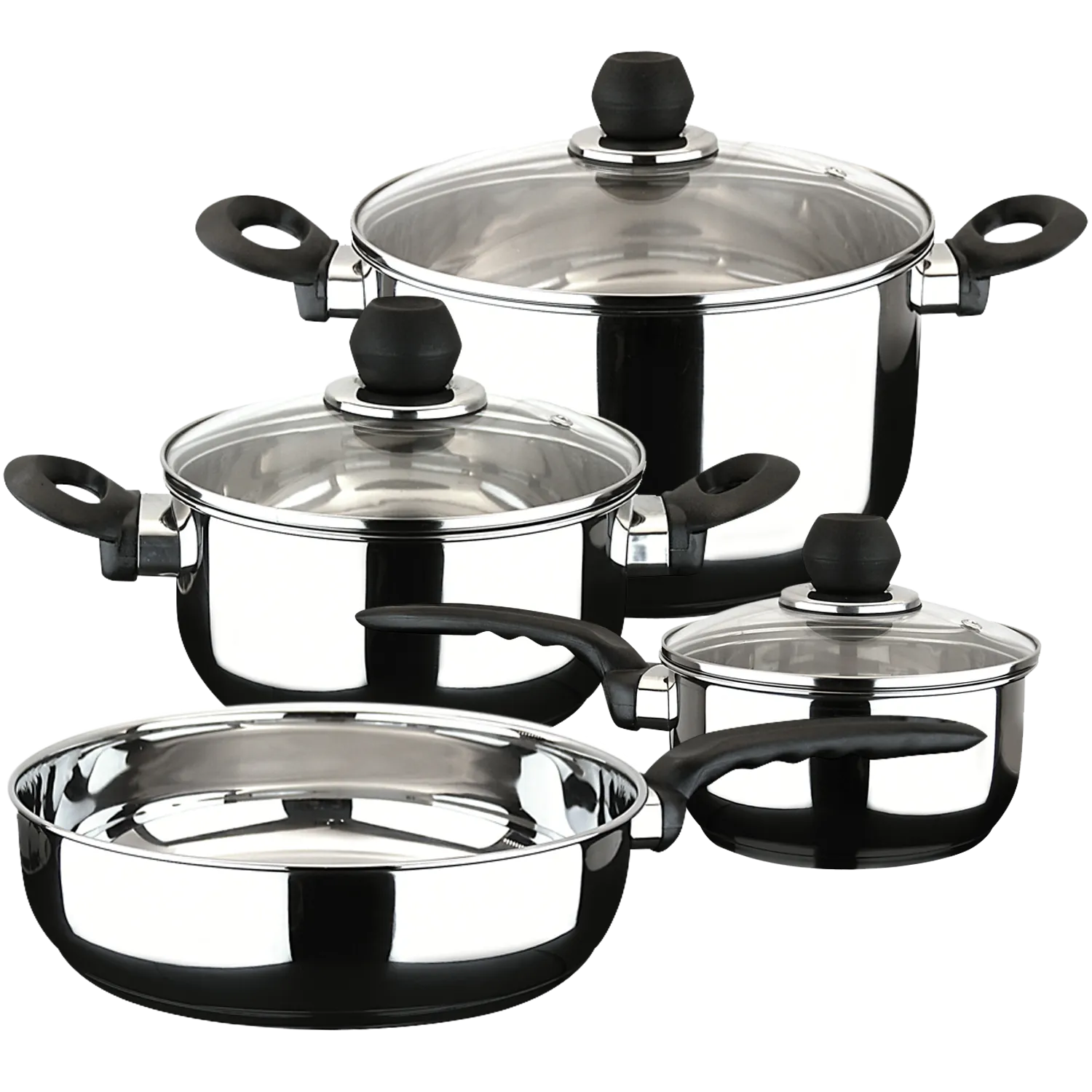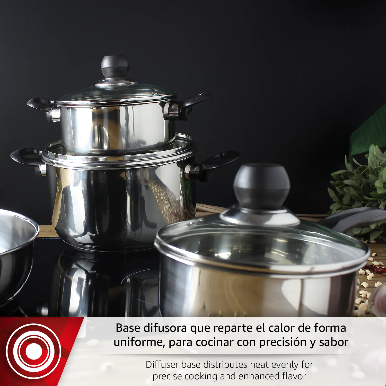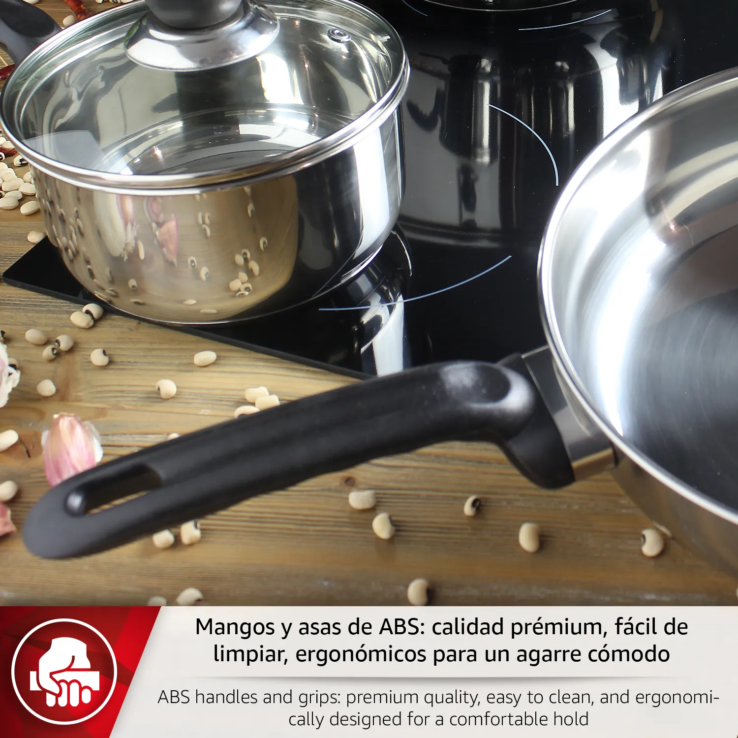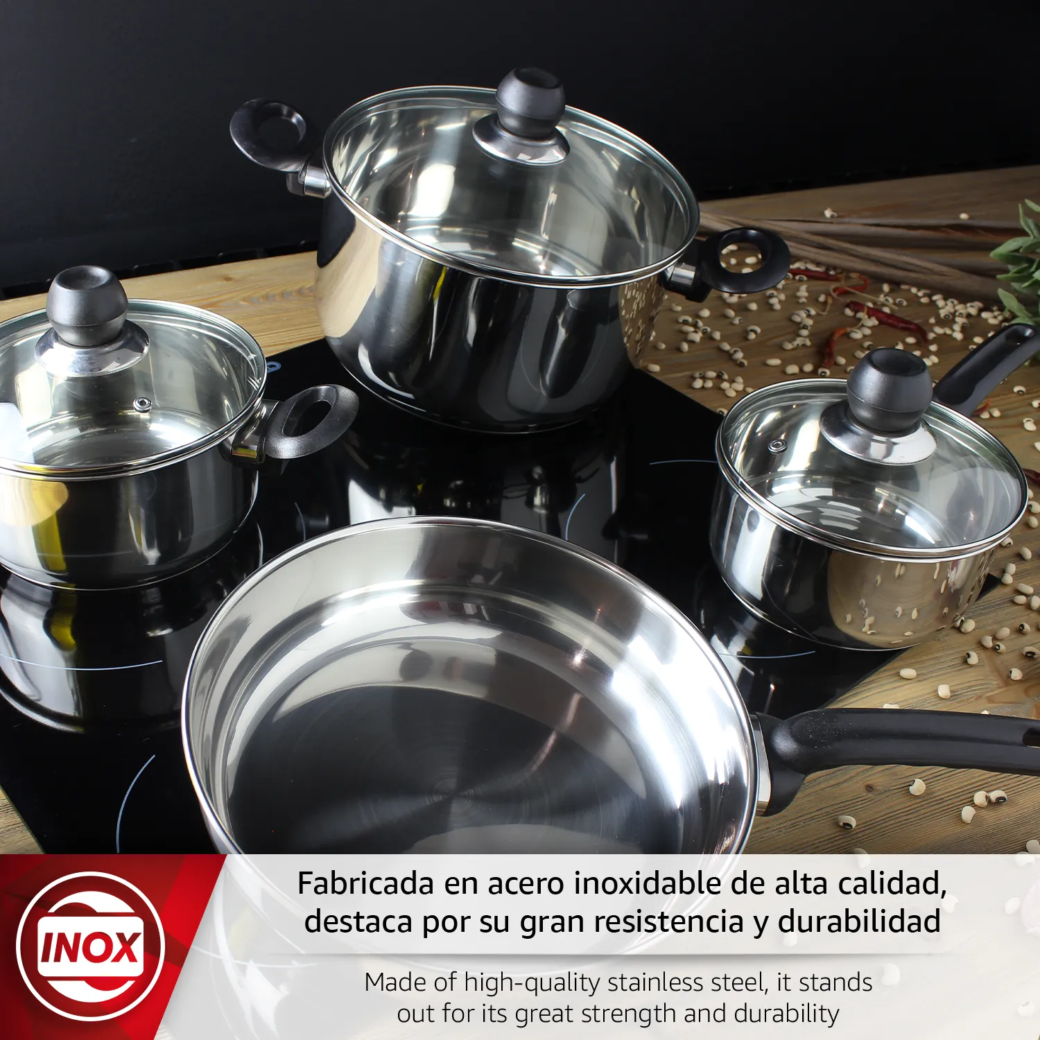 PRACTIKA Batería de Cocina de 7 Piezas Fabricada en Acero Inoxidable, Diseñada con Compatibilidad en Todas las Cocinas y Óptima Retención del Calor