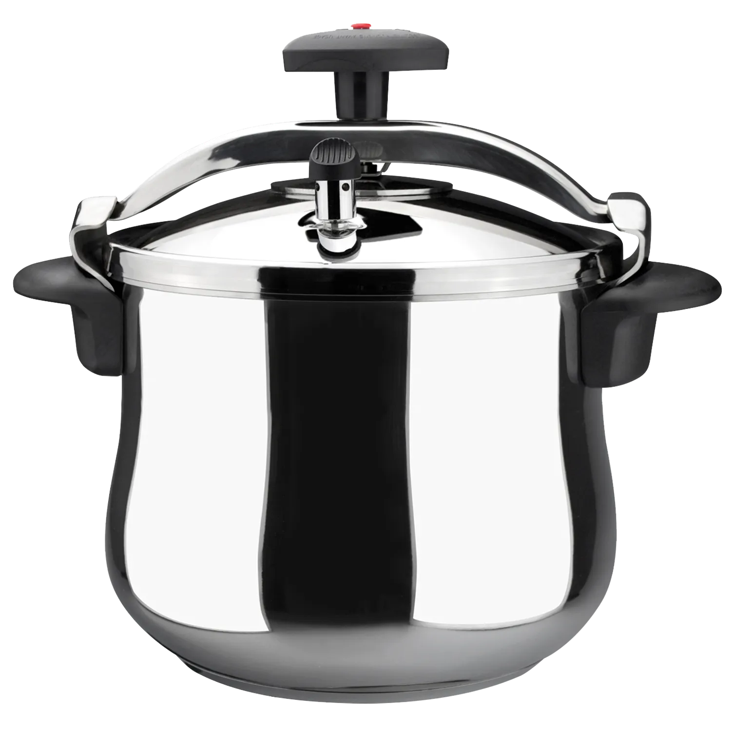 La STAR BOMBEADA olla a presión, está fabricada en acero inoxidable 18/10 un material muy resistente al desgaste, con fondo termo difusor encapsulado de 5 capas para un reparto homogéneo del calor que la convierte en apta para todo tipo de cocinas, incluida la inducción. Su diseño bombeado la hace ideal para cocinar piezas de carne completas.